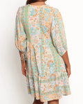 This dress features a bohemian floral print, a V-neckline, and puff sleeves with tie details, crafted from lightweight and breathable fabric. The midi length and flowy silhouette create a relaxed and feminine look, perfect for summer vacations, casual outings, or beach parties. The button-front design adds a touch of vintage charm, while the vibrant print ensures you stand out in any crowd. The soft and comfortable material makes it easy to wear all day long, making it a versatile addition to your wardrobe.