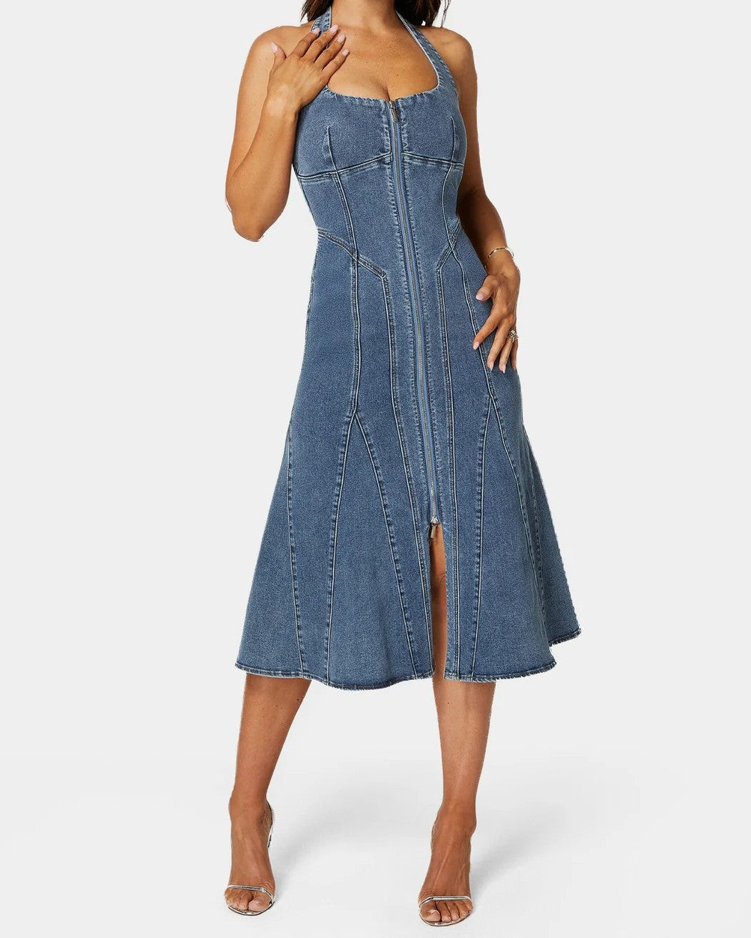 This dress features a stylish halter neck design and a corset-inspired silhouette, crafted from high-quality denim fabric. The midi length and flared hem create an elegant and feminine look, while the front zipper and back pockets add functional details. Perfect for both casual outings and semi-formal events, it offers a versatile style that can be paired with heels or sandals. The structured denim material ensures a flattering fit, accentuating the waist and hips for a confident appearance.